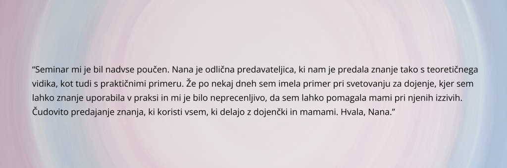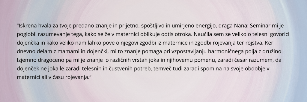 Za sabo imam ogromno izobraževanj in seminarjev, kjer sem se učila različnih tehnik. Vedno pa mi je nekaj manjkalo. In to je, da bi mi nekdo povedal kako videti širše, kaj se dogaja zadaj. Ko dojenček joka, pa ne veš kaj narediti. Kako reagirati, ko izgleda da terapije sploh ne boš mogla izvest. Kaj narediti, ko vidiš, da so starši skeptični? Kaj narediti, ko ti kot terapevtu med samim delom na plano pridejo lastne rane?